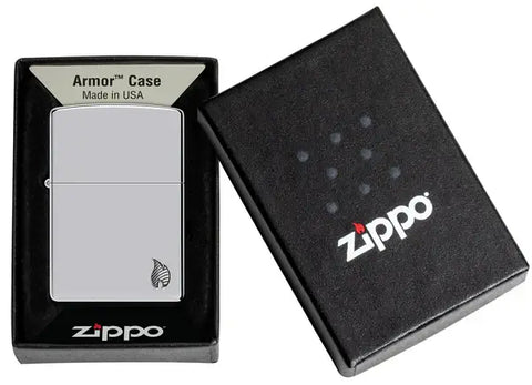 Add a touch of understated luxury to your collection with this Armor® High Polish Chrome lighter. The classic Zippo flame icon appears in the bottom-right corner in a minimalist Deep Carve design. Comes packaged in a gift box. For optimal performance fill with Zippo lighter fuel.