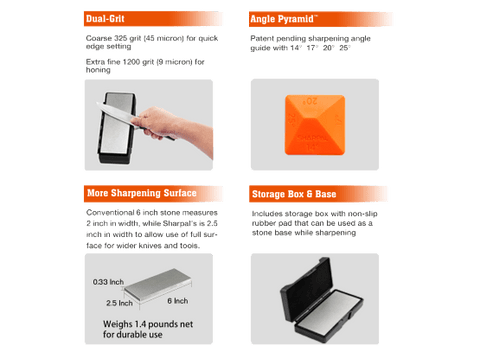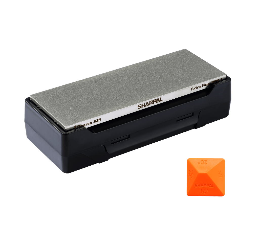 SHARPAL 162N Dual-Grit Diamond Whetstone that measures 8 inch X 3 inch is capable of handling a wide variety of edges including kitchen and pocket knives with either a single or double bevel on the blade, tools and much more. With MirrorFlat™ technology, hard wearing surface and durable design, it guarantees consistent, even sharpening for years of dependable use. It is double-sided with both coarse and extra fine diamond surfaces. Use the coarse diamond stone 325 grit (45 micron) to quickly and easily restore a dull or damaged edge. Use the extra fine diamond stone 1200 grit (12 micron) to hone. Sharpen dry. No messy oil needed. It comes with a high-impact plastic self-storing case with non-slip rubber pad that can be used as a stone base while sharpening. More value-added gadget is the patent pending Angle Pyramid™ Sharpening Angle Guide integrated with 4 angles-14°, 17°, 20°, 25° for choice for almost all kinds of knives.