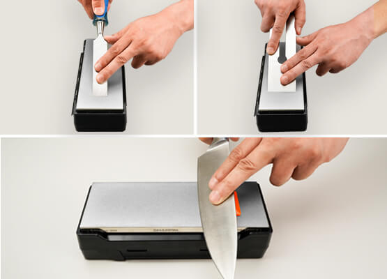 - Includes storage box with non-slip rubber pad that can be used as a stone base while sharpening