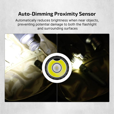 - Feels Right in Hand – Real Tactical Control: It features an oversized side switch that’s easy to access—even with gloves—and a knurled tail switch for a secure grip and smooth activation. A built-in smart proximity sensor dims the beam when objects are near.