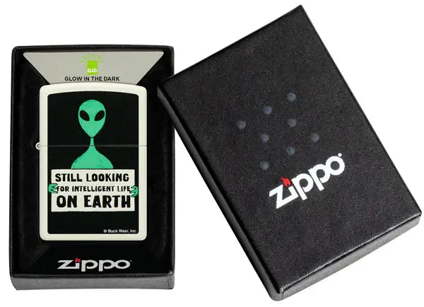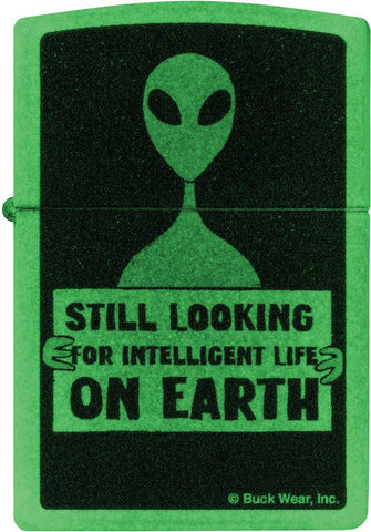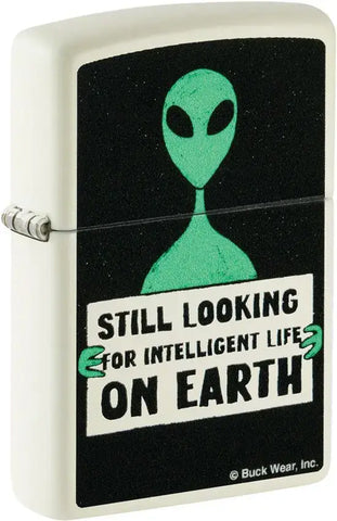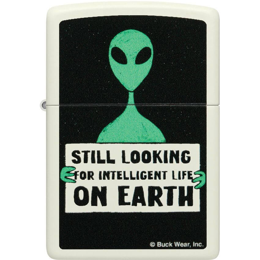 This design from Buck Wear™ says what a lot of people are thinking. Set on a classic Glow-in-the-Dark lighter, a disappointed extraterrestrial holds a banner stating, "Still looking for intelligent life on Earth" in a whimsical Color Image design. Comes packaged in a gift box. For optimal performance fill with Zippo lighter fuel.