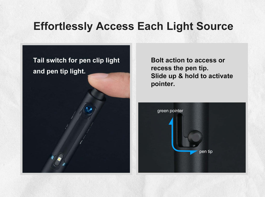 Versatile 4-in-1 Design: Combines the functionality of a pen, pen clip LED light, pen tip LED light, and green pointer beam into one sleek device, suitable for writing, reading, presentation, etc.