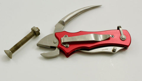 Myerchin® Sailors Tool with high visibility red Aluminum handle slabs. Stainless steel frame.  Double Lock (securely locks blade, spike, or both).   Includes Ballistic nylon sheath,  440 C stainless steel  3/4 Serrated blade, 1/4 Traditional blade.  One hand open, tether loop, belt/swim trunks or pocket clip, fully functional pliers for opening shackles, etc.  This unique design represents the result of years of testing in the field.