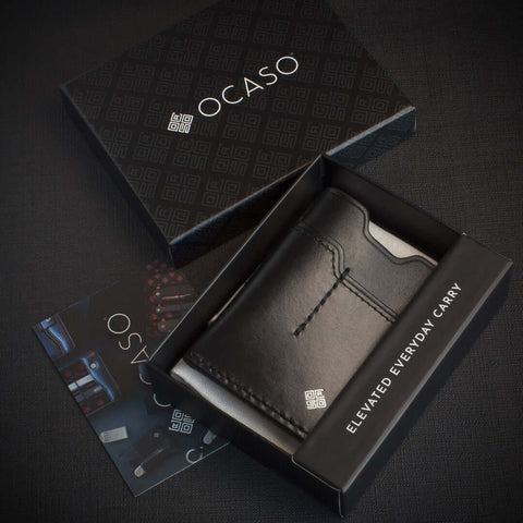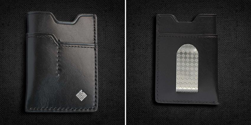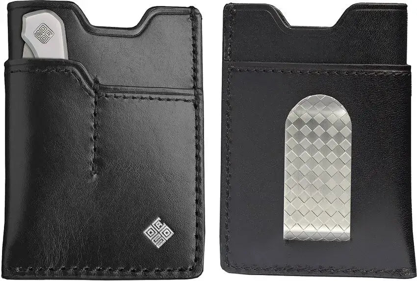 The EDC Wallet was designed to hold your essential everyday carry items: 3-6 credit cards, cash, and your favorite small pocket knife and pen. Crafted from full-grain leather and featuring a wrap-around pocket which holds a small pocket knife and pen in the front and additional credit cards in the back. The top pocket is notched for easy card access. Since this wallet was designed to hold a knife, it's most comfortable when carried in your front pocket. The lightweight, removable stainless steel diamond patterned money clip securely holds 10+ folded bills and is elegant enough to be carried on its own.